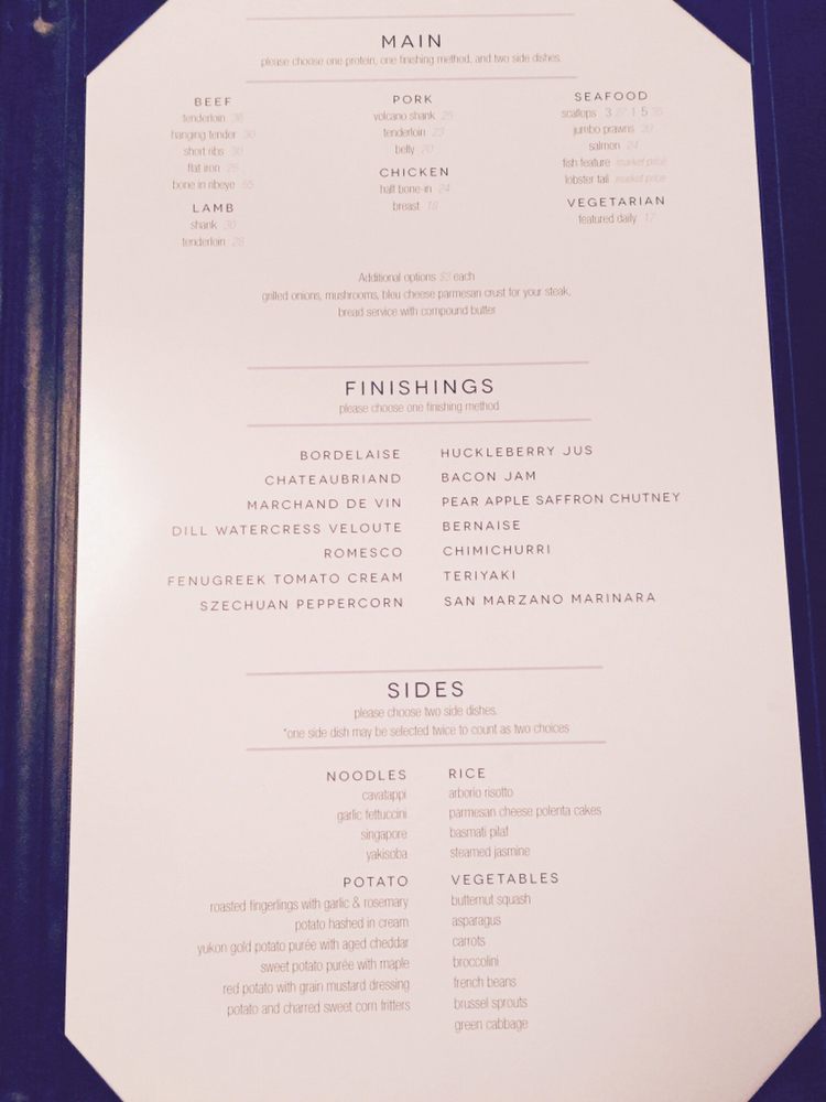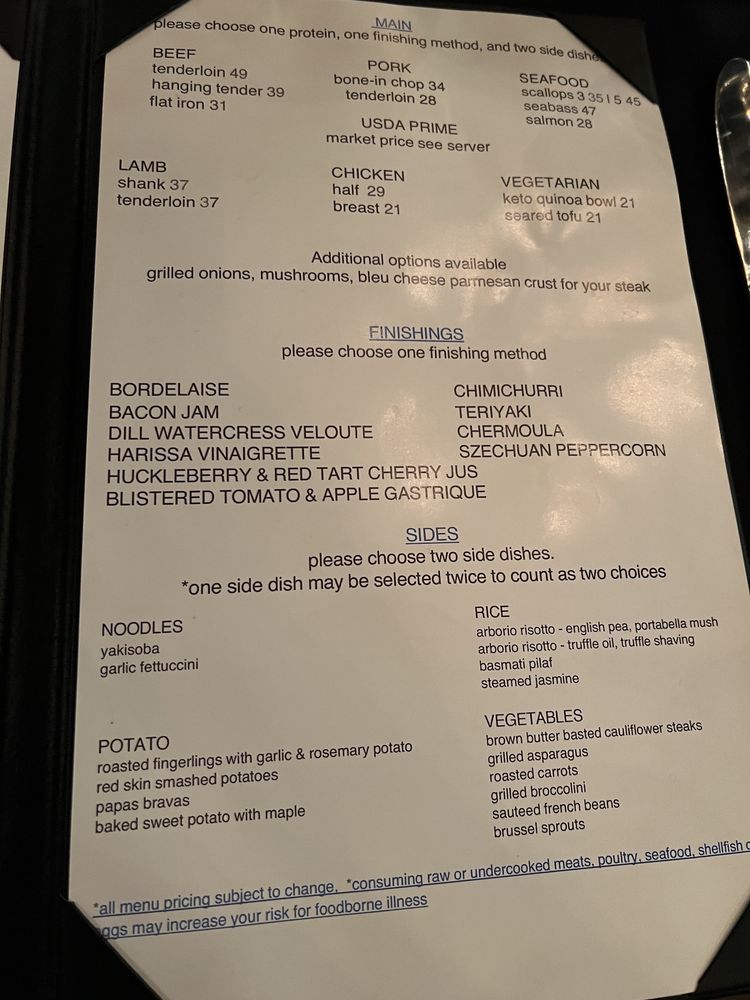 - Main courses feature options for meat lovers and pescatarians alike, with USDA Prime beef and seasonal seafood.